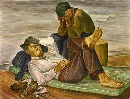 I entered a flophouse and climbed the stairs. I passed through stairs with open urinals and toilets at each landing, with seedy looking men using them – desperate men living in bleak nothingness and filth. I came to near the top. Many people sat together at tables in this common room. It was dingy, filthy, full of dust and cobwebs and seedy people. The building was decrepit and decaying – I wondered how it still held and stood without collapsing (this society). It was in such disrepair. A bunch of people gathered at a table to play cards. They were trying to make conviviality in this dismal place. I could not believe the sad place I saw. These people were living in decay – the lowest of society.